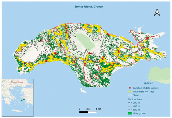 - Kavroudakis, D.; Kizos, T.; Tscheulin, T.; Katsikogiannis, G.; Stavrianakis, G.; Tsalta, L. Spatial Analysis of Olive Fly on Samos Island. Int. J. Pest Manag. in press.