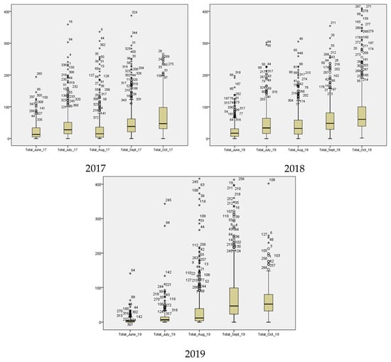 OFF populations measured in our trap network were not statistically significantly different in the three reference years. (Table S1). The season in 2019 starts with significantly lower OFF adult counts in the traps, compared to 2017 and 2018 (Figure 2), even though maximum values do not differ so much due to the presence of so-called “hot spots”. This pattern continues into July, with the counts of 2019 being as low as 25% of those in other years but with a very high maximum value. In August, OFF counts in the traps in 2019 catch up with those of two previous years, while the highest maximum values of arrests are also recorded in 2019 (one count is more than 1350 OFFs). The lowest counts for August are recorded in 2017. This high growth rate continues in September 2019 with very high average trap arrests, as well as the absolute maximum value of arrests. Counts in October 2019 drop again below the average values of the two previous years. These developments seem to follow the weather conditions of the month in question and those of the previous month.