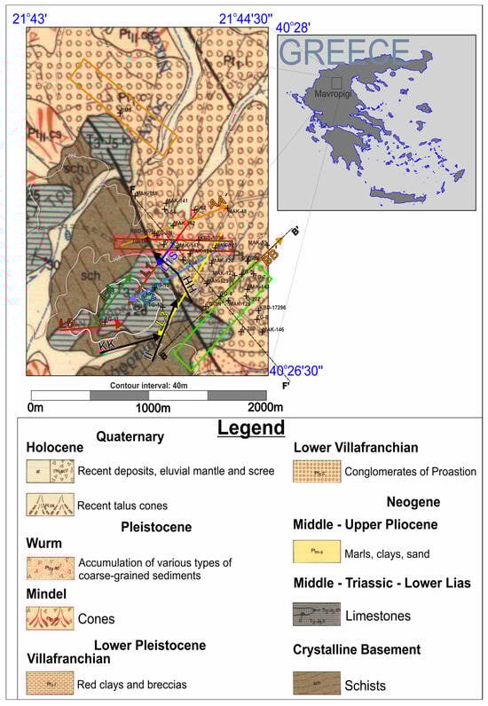 The investigated area is located within the Florina, Ptolemaida, Kozani, and Sarandaporo graben systems in NW Macedonia, Greece [37]. This region belongs to the Pelagonian geotectonic zone. The basement and borders of the depression are composed of semi-crystalline to crystalline Triassic–Jurassic limestones, marbles, dolomites, and schists (Figure 1). The basin filling process began during the Late Miocene–Early Pliocene period. Various types of deposits, including terrestrial, fluvial-torrential, fluvial, lacustrine-fluvial, lacustrine, and marshy deposits, filled the basin and contributed to the smoothing of the irregular surface of the graben basement. In the survey area near Mavropigi village, the Neogene formations are dominant and primarily consist of marls, sandy marls, and clay marls. These Neogene formations also host lignite beds, indicating the presence of coal deposits in the area. The Quaternary formations, with a thickness of a few meters, are comprised of eluvial mantles and alluvial deposits. The geological map and the survey lines of the investigated area are shown in Figure 1.