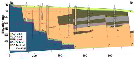 The Greek Public Power Corporation applied an initial drilling program for delineating coal deposits (all but the TG boreholes in Figure 1). These boreholes usually did not reach the base of the pre-Neogene formations. As the excavations on the southern side of the Mavropigi open pit mine approach the edge of the Quaternary basin, stability issues of the final mine slopes have emerged. The geological information of the area was enriched with new geotechnical wells (BM5 &TG-1 to TG-13). The main target of this drilling program was to explore the depth and the dip of bedrock near the southern edge of the Mavropigi open pit mine. Two problems were revealed: (a) steep schist bedrock and (b) limestone bodies found over the schist bedrock. In addition, a 10–15 m thick tectonic contact zone was observed between the schist bedrock and the overlain limestone. This zone consists of completely weathered schist and/or limestone material. A typical geological section, which combines old and contemporary geological data, is shown in Figure 2.
