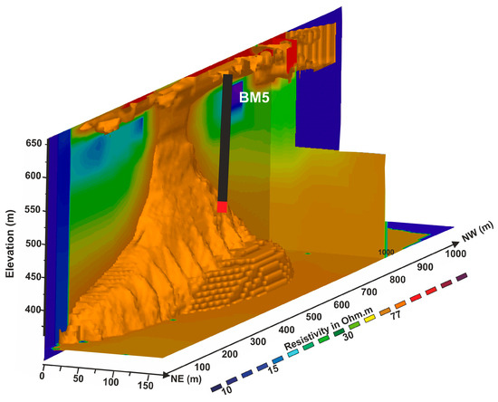 A view from the east–northeast of the 3D resistivity model. The contour of 77 Ohm · m (orange to red) delineates the top of the schist formation. Borehole BM5 is displayed in black and Quaternary, Neogene sediments, and Schist formation is in red.