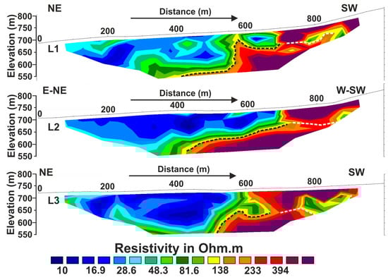 Geoelectrical sections (L1, L2, and L3) for gradient array. The black dotted line is attributed to the top of the schist bedrock and the white dotted line to the contact zone between the limestone and schist formations (tectonic contact).