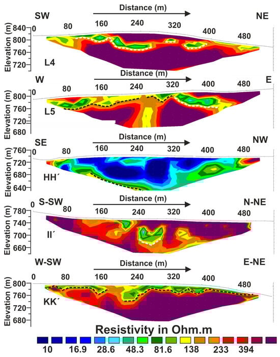 Geoelectrical sections (L4, L5, HH’, ΙΙ’, and ΚΚ’) for gradient array. The black dotted lines correspond to the top of the schist bedrock and the white dotted lines are attributed to the contact zone between the limestone and schist formations (tectonic contact).