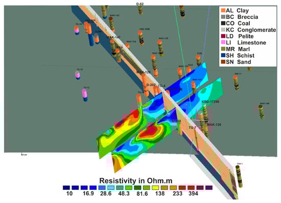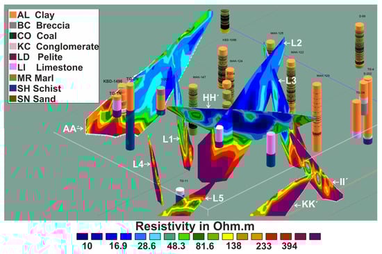 Fence diagram of selected geoelectrical sections (L1, L2, L3, L4, L5, AA’, HH’, ΙΙ’, and ΚΚ’) for the dipole–dipole array. Lithology logs from boreholes at the survey area are shown as vertical cylinders, colored according to the legend at the upper left of image. View from the southwest.
