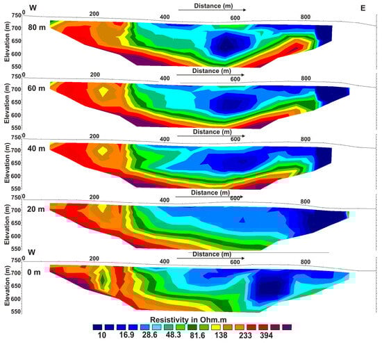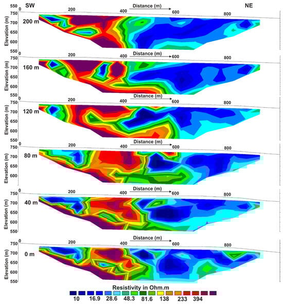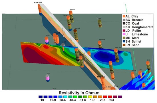 Figure 9 displays 2D geoelectrical sections from the south grid where the maximum depth to bedrock (resistivity values higher than 150 Ohm·m) is approximately 400 m. Based on the combination of geological data (boreholes and geological section) and the two geoelectrical sections extracted from the 3D model (Figure 10), it is determined that the southwestern part of the south grid comprises schist and Triassic limestone formations.
