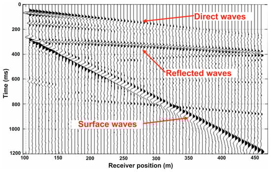 After obtaining encouraging results from the simulations, the next step involved acquiring seismic reflection data in the field. The seismic reflection method focused on scanning a portion (L1S) of the geoelectrical line L1, as shown in Figure 1. In the field, dynamite was utilized as the seismic source, which was placed in holes at depths greater than the thickness of the weathered layer. These holes were filled with sand to improve the coupling between the seismic source and the ground. The amount of dynamite was, in most cases, 4 kg. Noise test records (Figure 16) determined the optimum nearest offset.