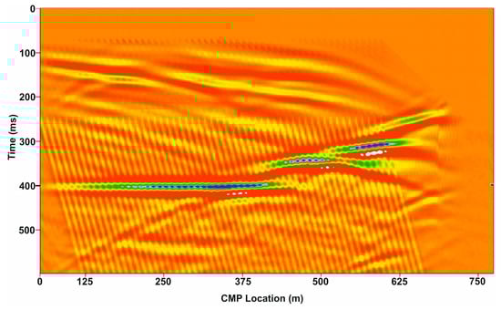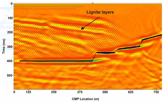 Consequently, traces were sorted in CMPs (Figure 18a) followed by velocity analysis using semblance for the CMPs whose number of traces (fold) exceeded 11. For the NMO correction in CMP gathers (Figure 18b), the root mean square (RMS) velocity model, shown in Figure 19, was employed. The processing workflow is displayed in Figure 20. The spectral balancing technique applied on the stack section recovered the amplitudes of the seismic trace and increased the dominant frequency from 20 to 30 Hz [43] (Figure 21a). The depth section is the outcome of post-stack explicit finite difference depth migration [44] (Figure 21b). In the migrated section, the reflectors are placed shallower with higher dips. In Figure 22, the depth-migrated section and borehole D-205 were superimposed on the corresponding portion of the ERT section (dipole–dipole array) from Line 1. This borehole is off the line at a 58 m distance from L1, and its projection intersects Line L1 at 430 m (Figure 1). From the migrated section, a normal fault is present, which (according to the ERT section) exceeds 100 m. From the comparison of electrical tomography and seismic sections, we observe an acceptable fit regarding the fault. The seismic section provides more accurate information about the inclination of the fault. This fault appears from 450 m until the end of the seismic section, and its inclination is approximately 45 degrees.