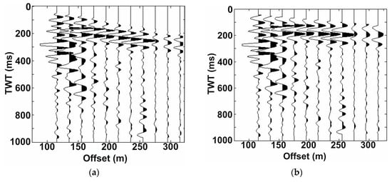 CMP gather at 465 m before (a) and after (b) NMO correction.