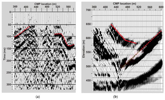 (a) Stack section. (b) Depth-migrated section. The red lines correspond to the schist bedrock and the red dashed line indicates a fault.