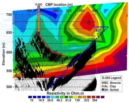 Superposition of depth-migrated section on ERT Line 1 (dipole–dipole array). Red line corresponds to the schist bedrock and blue dashed line indicates a fault with a dip of 45 degrees.