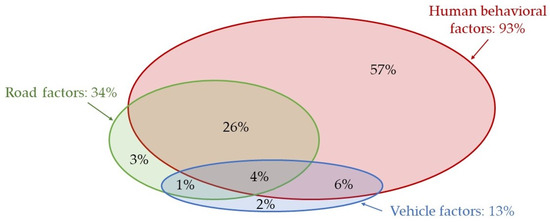 The identification of defects, with regard to road safety, in cities’ transportation systems is of great importance, and it also continues to have an essential role in this new era that arises with the appearance of innovative mobility services. As such, the detection of black spots (also referred to as hot spots, hazardous locations, and high accident concentrations) is always at the core of road safety. Black spots are characterized as road locations or sections where the recorded number of accidents is higher than the stochastic expected value during a certain period of time [11,12]. Because driver behavior and vehicle factors are constants throughout a country, this accident concentration could occur due to a variety of reasons, which may be connected to infrastructure defects like poor geometric alignment or local risk factors like traffic or weather; as shown in Figure 1 in such cases (road factors) is attributed a high percent of road accidents. In international fieldwork, there is no common unanimity about the definition and the methods of finding black spots [13,14,15,16]. However, especially in countries with high accident records, the identification and treatment of road black spots would be of outmost importance for road safety improvement. The most productive approach seems to be to concentrate on a project level, i.e., on a specific road corridor, identify specific causes and patterns of accidents, and act to heal them (reactive approach) [17].
