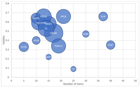 Measures as a function of their validity, number of items, and proportion method variance. Note: For full names of instruments, see Table 1. The size of the circle refers to the proportion method variance. The bigger the circle, the higher the proportion of method variance.