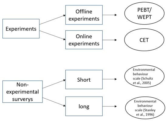 In Figure 2, we present a preliminary decision tree based on the current results, which may help to select a measure. We propose to use the PEBT or WEPT for offline experiments in the lab, while the CET is fit for online experiments. For non-experimental assessments, the data points towards the Environmental Behavior Scale (ebs05) [23] and the Environmental Behavior Scale (SLW) [29]. Based on Figure 1, it can be noted that both the ebs05 and the SLW are relatively high on (convergent) validity and relatively unaffected by method bias. The Environmental Behavior Scale [23] is more fit when a short scale is warranted, while the SLW has a broader coverage as it uses more heterogenic items.