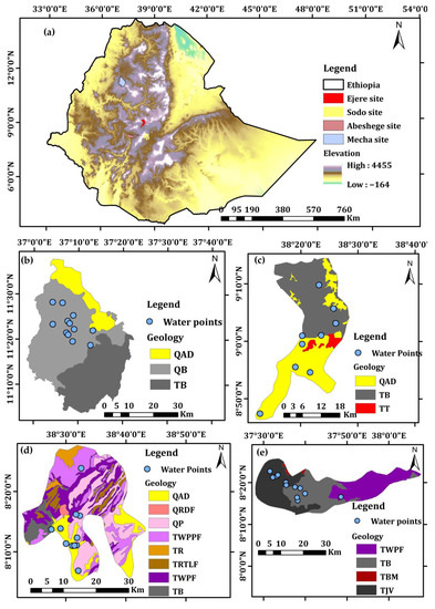 (a) Location maps of four study sites in Ethiopia, (b) geological map of Mecha site, (c) geological map of Ejere site, (d) geological map of Sodo site and (e) geological map of Abeshege site. The lithological units are: QAD = Quaternary alluvials, lacustrine and soil deposits, QB = Quaternary basalt, TT = tertiary trachyte, QRDF = Quaternary rhyolitic domes and flows, Quaternary pyroclastics, TR = tertiary rhyolite, TRTLF = tertiary rhyolite and trachyte lava flows, TWPPF = tertiary welded to partially welded pyroclastic flows, TWPF = tertiary welded pyroclastic flows, TB = tertiary Miocene flood basalt, TBM = tertiary Oligocene flood basalt and TJV = tertiary volcanics (basaltic and rhyolitic composition) of Oligocene flood basalt.