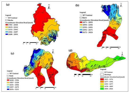 Groundwater elevation head and water table contour map depicting groundwater flow direction: (a) Mecha site, (b) Ejere site, (c) Sodo site and (d) Abeshege site.