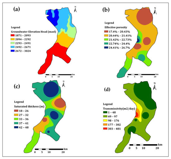 Four raster maps of the Abeshege site: (a) groundwater elevation head, (b) effective porosity of the aquifer, (c) aquifer saturated thickness and (d) the transmissivity map.