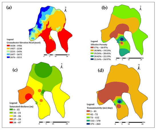 Four raster maps of the Ejere Site: (a) groundwater elevation head, (b) effective porosity of the aquifer, (c) aquifer saturated thickness and (d) the transmissivity map.