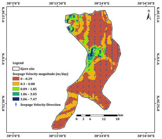 The Ejere site groundwater flow velocity showed values from 0 to 7.47 m/day (Figure 9). The highest groundwater flow velocity magnitude is observed at the central and northwestern parts of the site in fractured and weathered volcanic units affected by geological structures, whereas the dominant part of the study site indicates low values of groundwater flow velocity magnitude in a less-fractured massive tertiary basaltic formation and trachytic units in the northeastern and the depressed Becho Plain that exhibit alluvial deposits. Furthermore, in low groundwater flow velocity regions there are limited effects of geological structures. As compared to all other study sites, the Ejere site shows low ranges of groundwater flow velocity magnitude. The groundwater flow velocity direction is towards the south, following the regional groundwater flow direction from the plateau sectors to the Becho Plain.