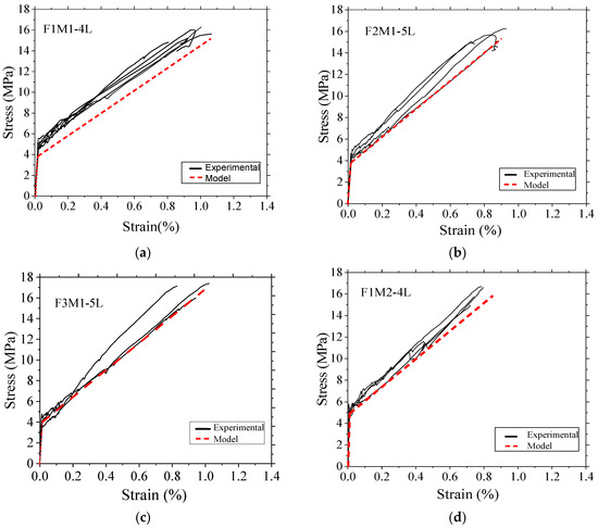 Comparison of the stress–strain response from the model with experimental data for composites with matrices M1 (a–c) and M2 (d–f).