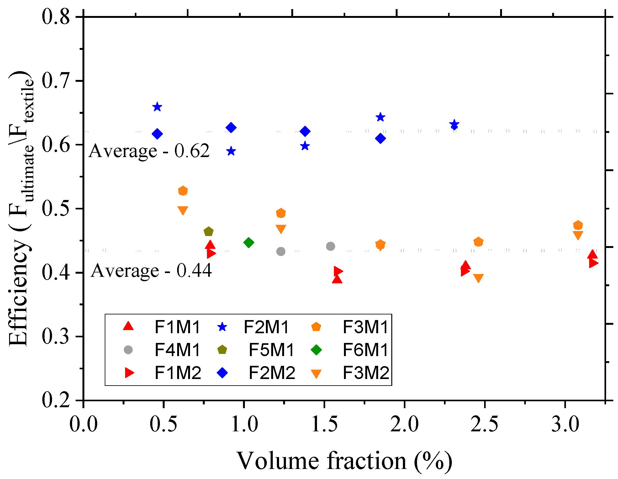 | Composite | Volume Fraction (Vt) | Average Efficiency Factor (k) | Average Effective Volume Fraction | Behavior |