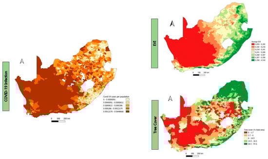 Moderate Resolution Imaging Spectroradiometer (MODIS)—Satellite imagery containing vegetation index, specifically Enhanced Vegetation Index (EVI), with a 250 m spatial resolution was extracted from MODIS. This raster-based satellite imagery contained country-level data about greenness (measured monthly). We extracted data on greenness over a 30-month period from January 2020 to June 2022. This period represented the duration of the pandemic in South Africa up to the date of data collection for the current study (4 June 2022). A layer representing the average greenness for the 30-month period was created by dividing the sum of all the layers by 30 using the raster calculator tool in QGIS. The resultant layer was then multiplied by a scale factor of 0.0001 to obtain EVI values ranging from −1 to +1, as per the product specifications (https://lpdaac.usgs.gov/products/mod13q1v061/, accessed on 26 June 2022). The Zonal Statistics tool in the QGIS platform was used to calculate the mean values for EVI in each administrative unit (local municipality and Ward). The zonal statistics were calculated using vector-based shapefiles for South Africa’s local municipalities and Wards, which were obtained from the Municipal Demarcation Board (https://www.demarcation.org.za/, accessed on 26 July 2023). The data were then saved as an Excel document using the export function in QGIS.