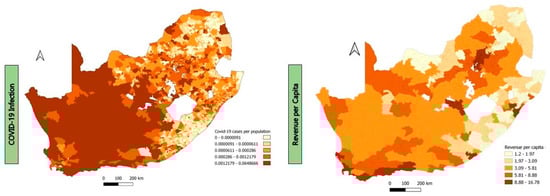 Socio-demographic Data—We retrieved data describing population size (total number of people in an area), revenue per capita (in Rand per person), and proportion of population over the age of 65 years (percentage). These data were retrieved from the Local Government Handbook: South Africa portal (https://municipalities.co.za/, accessed on 2 July 2022). Population density was calculated by dividing the total population by the total surface area of a given administrative unit. Population density is included as a predictor of COVID-19 infection, assuming that higher population density is more likely conducive to more COVID-19 infections. Annual revenue, however, is included on the basis that COVID-19 infection rate is higher in low-income communities than not [16]. The inclusion of the “proportion of population over the age of 65 years” is justified by the evidence that older people are more likely to experience severe symptoms of COVID-19 than younger people [52].