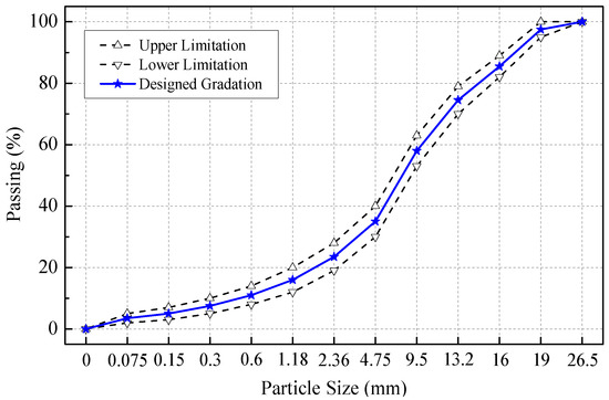 In this study, the used aggregate was crushed limestone, produced in Tongchuan. According to the test methods in JTG E42-2005, the properties of coarse and fine aggregate met with the requirements in JTG/TF20-2015 [27,28]. The designed composition of the UGM was median gradation according to the specifications in JTG/TF20-2015 [28], as shown in Figure 1. The coefficient of curvature Cc and non-uniformity Cu were 2.69 and 19.34, respectively. The specification stipulates that the soil has a well gradation when Cu is greater than 5 and Cc is between 1 and 3. This indicated that the UGM had a well gradation. Using the compaction test method in JTG E40-2007 [29], the maximum dry density of the designed gradation was 2.386 g/cm3 and the optimal moisture content was 5.3%.