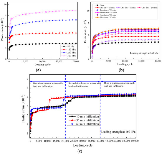 Plastic strain of UGM under three working conditions: (a) repeated load only; (b) repeated load after infiltration; (c) simultaneous action with load and infiltration.