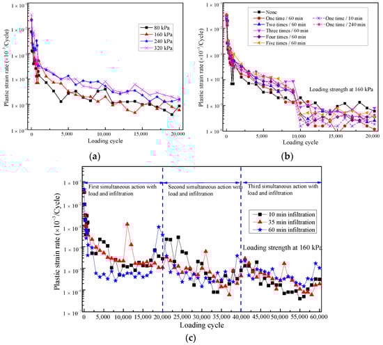 Plastic strain rate of the UGM under three working conditions: (a) repeated load only; (b) repeated load after infiltration; (c) simultaneous action with load and infiltration.