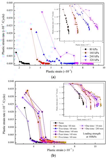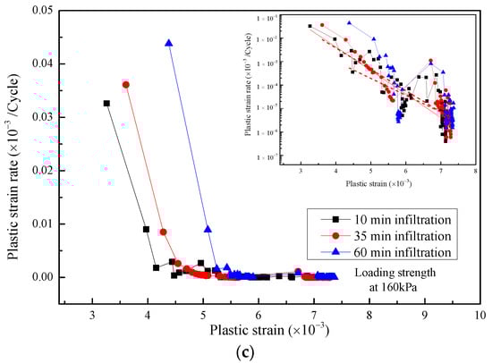 Based on the characteristics of plastic strain and plastic strain rate in Figure 2 and Figure 3, the relationship between them is shown in Figure 4 with linear and logarithmic vertical ordinates. In the linear coordinate system, a downward convex parabolic relationship existed under the three working conditions. When the plastic strain was small, the plastic strain rate changed fast, and it approached zero when the plastic strain increased to a certain extent. This was consistent with previous conclusions that plastic strain reached a stable value after a certain number of loading repetitions [13,34]. As shown in the subgraph in the upper right corner, the variation tendency was different under the three tests in the logarithmic vertical ordinate system. The variations were similar under the repeated load only and repeated load after infiltration tests. However, they fluctuated greatly under the simultaneous action test. There was an obvious turning point that corresponded to the beginning time of the simultaneous actions. According to the characteristics of the PUMA test, the stress state changed sharply when the loads started to be exerted. Then, there was a great increment in the plastic strain at the initial stage of load action. Therefore, the plastic strain rate at the beginning stage of the second and third simultaneous actions had a significant increase and a turning point. These phenomena indicated that the plastic strain was also affected by the intermittent infiltration. It was necessary to consider the number of infiltrations.