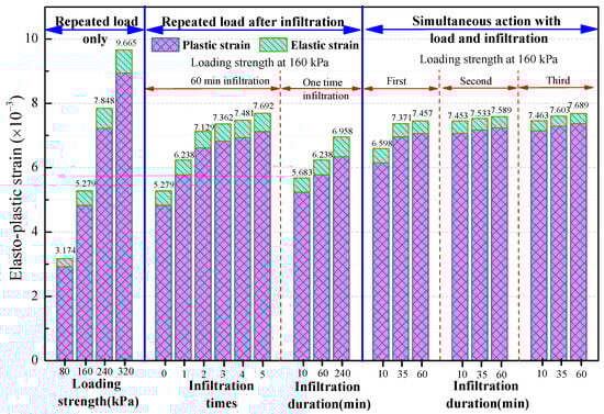With the three working conditions, the elasto-plastic total strain is shown in Figure 5. The plastic strain accounted for 91~96% of the total strain under the different conditions, while the elastic strain accounted for less than 9%. By contrast, the variation in total strain was greatly consistent with plastic strain. The total strain increased with the increase in loading strength, infiltration duration and number. Compared with repeated load after infiltration test, the plastic strain and total strain changed greatly under the simultaneous action test, while the elastic strain varied little. Under the simultaneous action test, the maximum difference in the total strain was only 0.3185 × 10−3, which only accounted for 4.2% of the average total strain (7.5198 × 10−3). This indicated that the total strain had little difference under the three simultaneous actions. However, compared with the repeated load only test, the total strain increased by 2.24 × 10−3 (accounting for 42.4%) under the simultaneous action. The value was 1.282 × 10−3 (accounting for 20.6%) compared with the repeated load after infiltration test. These differences showed that the increments were mainly caused by water infiltration. With water infiltration, the particles had a great tendency to migrate once the load was exerted, resulting in a larger total strain. The simultaneous action had an especially significant effect. There was not only load action, but also a dynamic water-scouring effect, leading to greater strain. Whether the repeated load followed or simultaneously acted with infiltration, the infiltration action had an important effect on the total strain of the UGM. Therefore, careful consideration should be given to the infiltration condition during the design and construction of UGM layers in permeable pavement.