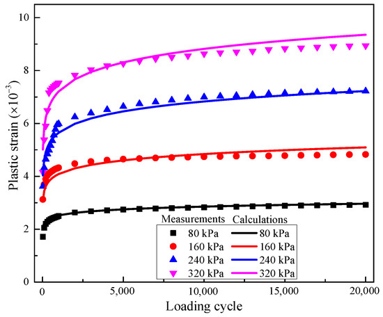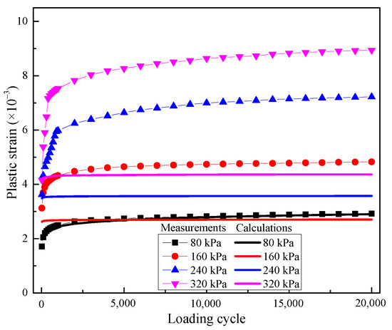 where εp is the plastic strain (10−3), σd is the loading strength (kPa), and N is the number of loading repetitions. Using Equation (3), the plastic strain can be calculated as shown in Figure 6. In addition, the measurements are displayed to make comparisons. This shows that the calculated plastic strain at 80 kPa had relatively good coordination with the measurements, while the calculation at other loading strengths greatly differed from the measurements. The maximum difference was up to 4.3657 × 10−3. This showed that the model in Equation (3) cannot effectively calculate the plastic strain at different loading strengths. This was because the parameters a and b had great sensitivity to the model, which had four parameters. Any changes would have a great impact on the results.