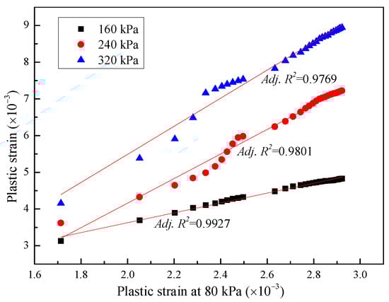 At different loading strengths, the plastic strain presented great similarities. The plastic strain at other loading strengths was linearly fitted with that at 80 kPa, as shown in Figure 7. The correlations were greater than 0.97, indicating that the variation trend of plastic strain was highly similar at different loading strengths. The plastic strain at different loading strengths had a good linear correlation with the plastic strain at 80 kPa. Therefore, the plastic strain at 80 kPa was taken as the baseline for linear fitting using the model εp = k × aNb + c. The fitting parameters k and c are shown in Table 6.