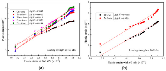 Taking the plastic strain at non-160 kPa (test serial number 2) and one-time 60 min infiltration (test serial number 5) as the baseline, the relationships between the baseline and plastic strain at different infiltration numbers and durations are shown in Figure 9. With the correlation analyses in step 2, the parameters k and c of the calculation model (εp = k × aNb + c) are shown in Table 7. The linear correlation coefficients between the infiltration factors and baseline were as great as 0.99 or more. This showed that the plastic strain had very high similarities under different infiltration conditions.