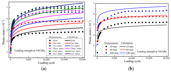 Plastic strain comparison between measurements and calculations under simultaneous action with repeated load and infiltration: (a) infiltration duration of 10 min; (b) infiltration duration of 35 min.