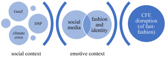 Before presenting the case study of Wardrobe, it is important to establish what needs to be disrupted by the CFE by examining how the DSP of the fast fashion industry operates and engages with consumers. Firstly, the paper will consider the social context, and having reviewed the fashion and marketing literature, it is concluded that it is Generation Z who mainly purchase fast fashion while also expressing heightened concern for the climate crisis [14,19]. This dichotomy [20] underpins the conceptual framework by illuminating the social constructs in which fast fashion operates; however, it must also be recognised that this social context includes a communicative interactive process that signals subliminal messages to others—representing self-identity that is both presented and seen socially [5,15]. Secondly, to encompass emotive contexts, this paper considers the role of online presentation on social media platforms that present self-identity and fashion through extended geographical social networks. Social media offers opportunities for everyone to have a platform and a voice but also enables increased competition and insecurities [21]. Generation Z have vast quantities of information available to them, as well as increased social pressure [22]. The literature suggests that social and aesthetic capital are more powerful constructs than values relating to sustainability concerns [15], and therefore appealing to ethical value has so far been unsuccessful in challenging the DSP of fast fashion [23]. Our conceptual framework comprises three elements, as presented in Figure 1, which will be examined in the sections below. The conceptual framework emerged from extant literature and focuses on understanding the context and concepts that require disruption to enable a new understanding of how to position the CFE as appealing to consumers.