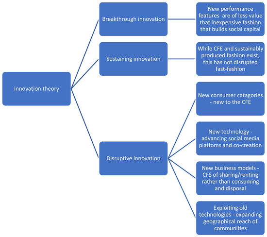 Christensen’s [17] seminal theory of disruptive innovation (DI) has been much cited over the last few decades, as well as being challenged on theoretical and practical elements (see [51]). Nevertheless, the theory does enable a closer examination on how to disrupt DSPs through the role of innovation and carve out new value propositions to support the CFE. As presented in Figure 3 below, the theory of DI sits amongst other types of innovation theory that are utilised to solve problems; what makes DI more relevant for this paper is how it can advance technological and marketplace shifts [52]. This is evident in how the fast fashion industry became possible through globalisation and technological advances, where low pricing was facilitated by cutting corners on good practices that protected the environment and workers. More recently, technology and the marketplace has shifted again through instant global communications accessible on smartphones [3] and offers a platform to share the growing concern for the climate emergency.