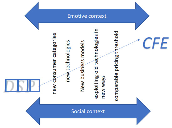 Lastly, Christensen et al. [53] assert that to be disruptive, innovation should emerge from the lower end of the market and appeal to consumers through innovative attributes. Therefore, brands such as Tesla, maker of electric automobiles, are not authentically innovative, as they appeal to the high end of the market and therefore are not affordable and accessible to a new market of consumers; rather than disrupting business models and technology, Tesla sustains innovation within the automobile sector. The lower end of the market represents consumers least willing to pay for the product [51], as represented in Figure 4, which fast fashion is currently sustaining within the DSP. Therefore, innovation that disrupts this DSP will need to entice low-end consumers by creating new values at a similar price point to move into the mainstream. Collectively, the proposed model of Figure 4 presents Christensen et al.’s [53] elements as imbued within social and emotive contexts, combining the conceptual and theoretical frameworks to demonstrate how to disrupt the DSP with the CFE. The next section introduces the case study and will examine how it relates to Figure 4.