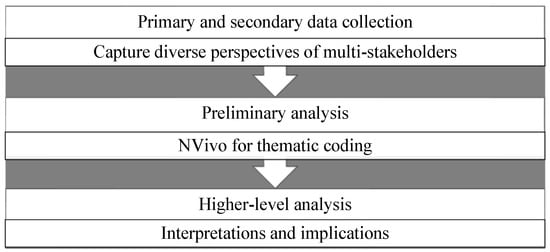 The steps for carrying out the research process began with primary and secondary data collection to capture the diverse views of stakeholders. Interviewees were issued copies of their transcripts for verification, and the findings were triangulated. More than 200 documents, including company websites of the grantees, reports and journal articles from Scopus, and wider business databases, were reviewed. Assembling data from multiple sources allowed confirmation of inferences through a recursive research design [] on the IE ecosystems that grantees were developing. Next, preliminary analysis led to thematic coding. When data saturation was reached, higher-level evaluation ensued to ensure rigorous results were achieved. The research path is illustrated in Figure 3.
