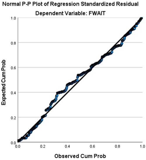 According to Table 8 and the graphs in Figure 3, the regression standard residuals show coefficients representing the outcomes of a regression analysis for Hypothesis 2, which examines the relationship between the perceived benefits of using IoT technologies for crop monitoring (PBIT) and farmers’ willingness to adopt these technologies (FWAIT). When all of the independent variables are zero, then the constant coefficient (B = 6.352) represents the estimated value of the dependent variable (FWAIT) when all of the independent variables are equal to zero. In this case, it indicates the estimated baseline level of farmers’ willingness to adopt IoT technologies for crop monitoring when the perceived benefits are zero. The constant coefficient is statistically significant (t = 5.028, p < 0.001), suggesting that it has a significant influence on the dependent variable. The coefficient for the perceived benefits variable (B = 0.930) represents the estimated change in the dependent variable (FWAIT) for each unit increase in the perceived benefits score, while holding other variables constant. The standardized coefficient (Beta = 0.458) indicates the standardized effect size, representing the relative importance of the perceived benefits compared to other variables. The coefficient for the perceived benefits variable is statistically significant (t = 11.512, p < 0.001), indicating that it has a significant impact on farmers’ willingness to adopt IoT technologies for crop monitoring. The positive coefficient suggests that as farmers perceive greater benefits from using IoT technologies, their willingness to adopt these technologies also increases.
