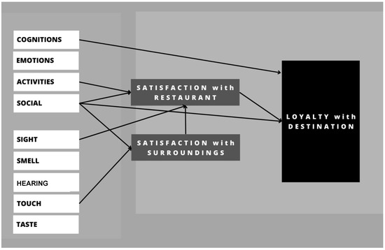 The aesthetic experience produces positive memories that are associated with the destination [39], which depends on sensory appreciation [44,45]. There exists a holism stemming from the physical, cultural and natural environment as far as the wine destination is concerned [12], such as soundscapes, smellscapes, aroma and touch [45]. The raw material of any wine is part of its landscape insofar as it is produced from the natural environment. The landscape is felt physically within the wine tourism experience [46]. The wine habitat is a part of the process and, in turn, the result. From the view of the experiential economy, climate and soil are determinants of wine production and consumption. The condition of being sensorial is nestled in experiences with local specifications [24]. Comparatively, similar to the precursors of the cellar’s perceived quality, the satisfaction with the cellar’s surroundings comprises a wide range of multidimensional antecedents. Equally, colour, smell and flavour positively influence and are intrinsic to the attributes of perceived quality [47,48]. These are vital if there is a well-delimited region, for example, an island. Therefore, when drinking wine in a cellar, it matters what is happening outside. Therefore, there is a relationship between the tourist’s senses and the destination environment [48]. On this basis, hypothesis 3 and its subsequent subhypotheses are put forward as follows: