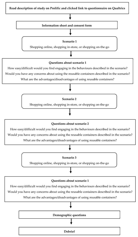 Figure 2 provides an overview of the procedure. Participants completed an online questionnaire on Qualtrics. After reading an information sheet and providing informed consent, participants were presented with a scenario describing how containers and packaging might be reused when completing grocery shopping online. The scenarios varied in terms of what information was presented across the three independent variables of (i) emphasis on tracking the containers (ambiguous vs. specific language), (ii) information about how the technology works (information provided vs. information not provided), and (iii) information about the benefits of using technology in reuse systems (benefits for the system vs. benefits for the consumer vs. no information on benefits presented). There was also a group of participants who were presented with information about a non-digital reuse system.