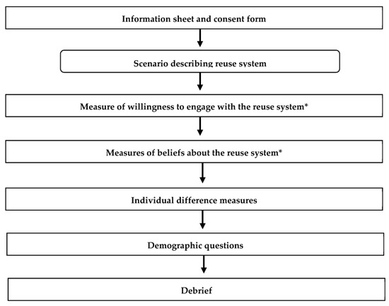 Figure 2 provides an overview of the procedure. Participants were asked to complete an online questionnaire on Qualtrics. After reading an information sheet and providing informed consent, participants were presented with one of three scenarios depicting a context in which containers and packaging might be reused. After reading the scenario, participants were asked to rate their willingness to engage with the reuse system and the extent to which they agreed with the statements designed to reflect potential beliefs about the reuse system. As it is possible that responding to the statements reflecting potential beliefs about the reuse system might influence participants’ willingness to engage, the order in which the measures of beliefs and willingness were presented to participants was counterbalanced across participants. To ensure that participants were paying attention, three statements were included, which asked participants to respond to the statement with a specific answer. For example, ‘Just to check you are paying attention, please select ‘strongly disagree’’. No participants failed the attention checks.