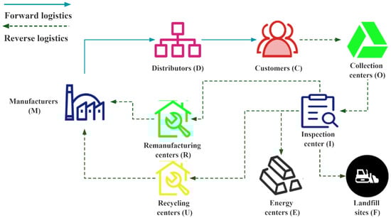 External factors pertain to the environment and context in which the supply chain operates, such as market demand, customer preferences, policies, and regulations, technological innovation, and competitive pressures. These factors determine the direction of development, the trend of change, and the adaptability and flexibility of the supply chain. Salehi-Amiri et al. [24] investigate the external social employment effects of a CLSC network in the avocado industry and propose a CLSC network that optimizes operational and social factors. Their aim is to minimize total costs and maximize job creation, and they have developed a MILP model to this end. Shahparvari et al. [25] develop models of reverse logistics networks with uncertain product flows and emphasize the effect of carbon tax changes on factory decisions. Marti et al. [26] explore the impact of environmental policies on supply chain networks by incorporating carbon footprint caps and carbon taxes as variables in the model. However, it does not consider other types of policies or regulations. Sazvar et al. [27] design a resilient supply chain network that can withstand variations in demand through an optimization framework that incorporates capacity planning and redundancy. Mishra and Singh [28] devise a nonlinear mixed-integer linear programming model that focuses on multi-country reverse logistics networks and explores the effectiveness of scaling up facility capacity as a strategy for improving the network’s efficiency. The research conducted by Eslamipirharati et al. [29] aims at developing a sustainable reverse supply chain network with two objectives, taking into account the effects of carbon tax policies and government subsidies. Most of the previous research studies on CLSC networks have not factored in government subsidies as an external variable. In contrast, the model presented in this paper incorporates government subsidies for remanufacturing, reprocessing, and energy recovery.