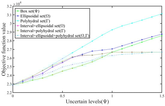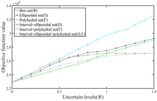 Figure 2, Figure 3 and Figure 4 indicate that for the ellipsoidal-based robust model, the solutions for both the ellipsoidal set and the “interval + ellipsoidal” set are the same when . When , both the ellipsoidal set-based robust model and the “interval + ellipsoidal” set-based robust model have the same solutions because of the identical uncertainty sets. For , the solution of the robust model in the “interval + ellipsoidal” set does not get better and reaches the worst-case scenario because the uncertainty set in the “interval + ellipsoidal” set is an interval of with no variation. When , the identical solution can be observed for both robust models induced by the polyhedral set and the “interval + polyhedral” set; when , the solution lies with the “interval + polyhedral” set-based robust model. When , the solution obtained from the “interval + polyhedral” set-based robust model reaches the worst-case scenario, and the objective function ceases to increase. These findings suggest that combining the uncertainty set with the interval will eliminate conservative solutions when faced with bounded uncertainty.