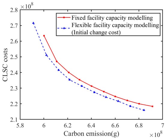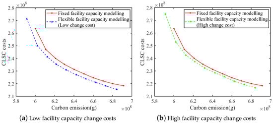 This paper presents a sensitivity analysis of the facility capacity change costs under the model to further validate the effectiveness of the flexible facility capacity strategy. The capacity level change cost was originally 300,000 and has been tested with low and high-level change costs of 100,000 and 1,000,000, respectively. Figure 7 shows the Pareto frontiers. Figure 7a,b demonstrate that the Pareto frontier of the flexible capacity model approaches the Pareto frontier of the fixed capacity model as the capacity level cost increases. Also, the flexible capacity model outperforms the fixed capacity model for different capacity level change costs. Thus, this analysis concludes that by providing flexibility in facility capacity levels in a CLSC, which results in a higher degree of freedom in decision-making, the overall performance of the CLSC network can be improved.