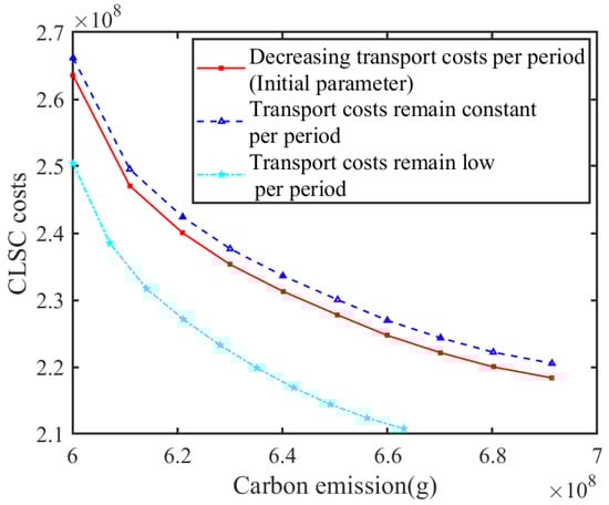 As presented in this paper, the flexible facility capacity model is superior to the fixed facility capacity model. Therefore, the following analysis will focus on the effects of the flexible facility capacity model. The first effect to be analyzed is the impact of transport costs on the flexible facility capacity model. Figure 8 demonstrates the Pareto frontiers variation of the flexible facility capacity model across three transport cost cases: (1) the first case is the base case for the model parameters, with transport costs decreasing from the first to the third period; (2) transport costs remain constant across all periods, including the second and third, where they are consistent with the first period; and (3) uniformly-distributed low transport cost parameters at [0.15, 0.3] are applied over the three periods. Figure 8 illustrates that keeping transport costs low outperforms the other two cases. The case of keeping transport costs constant exhibits the lowest level of performance. Keeping transport costs low and decreasing them both leads to a reduction in carbon emissions for the same costs as a CLSC. This reduction is brought about through the decreased costs of the CLSC. In the supply chain, distribution serves as the link connecting the different parts of the CLSC, and charges for distribution and transport represent a significant proportion of the overall supply chain.
