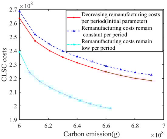 This section examines the effect of processing costs on the flexible facility capacity model. Three scenarios are considered: (1) decreasing processing costs over time, (2) constant processing costs, and (3) low processing costs. Low processing costs are defined as having parameters for remanufacturing costs that are uniformly distributed within U[20,23], reprocessing costs that are uniformly distributed within U[22,25], and energy recovery costs that are uniformly distributed within U[12,15]. As shown in Figure 9, the scenario with low reprocessing costs performs better than the other two scenarios. Lower processing costs allow for more efficient operation of the CLSC for the same level of carbon emissions. However, as processing costs increase, the performance of each objective in multi-objective optimization decreases.