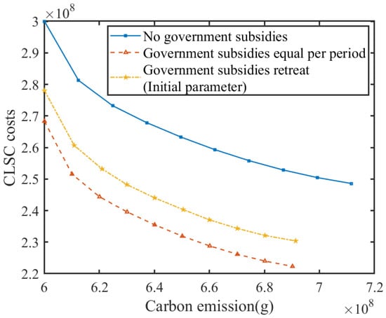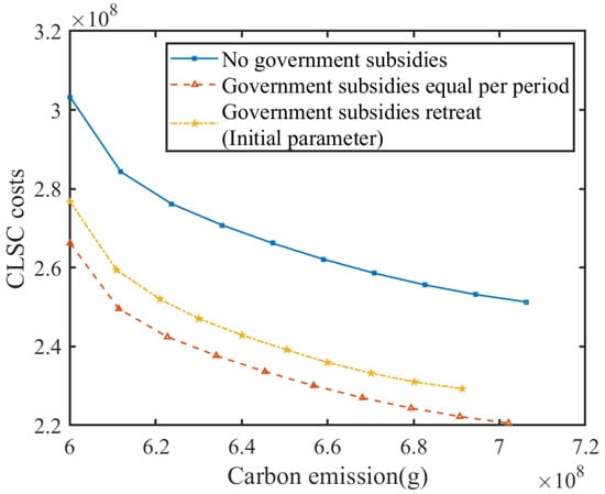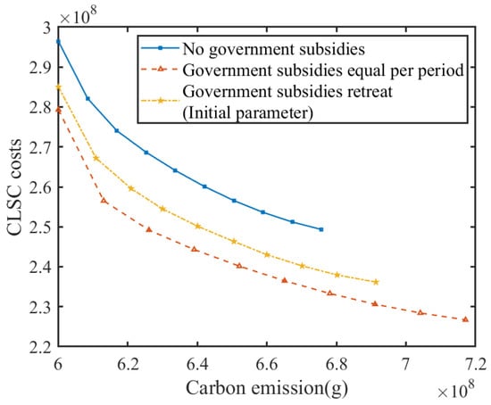 The second aspect is the impact of government subsidies on the reprocessing chain within the CLSC. Similar to Figure 10, Figure 11 demonstrates the modifications to the Pareto frontiers of the flexible facility capacity model for three different government subsidy scenarios: (1) No subsidy from the government for the reprocessing segment. (2) The government grants subsidies for the reprocessing segment, and the amount of subsidy per unit of product stays stable for three periods, akin to the first period. (3) The initial model defines the parameters, and the government subsidy gradually decreases. As demonstrated in Figure 11, the government supplies subsidies to the reprocessing segment to enhance the performance of the CLSC. Reducing subsidies raises the cost of the CLSC while keeping carbon emissions constant. Conversely, reducing subsidies increases carbon emissions in the CLSC while holding costs constant. Figure 12 illustrates the impact of government subsidies on the energy recovery chain in the CLSC, divided into three cases. The analysis parallels the above findings that government subsidies for energy recovery enhance the performance of the CLSC. It is important to note that minimizing the cost of the CLSC, while keeping government subsidies constant over time, can result in a substantial rise in the supply chain’s carbon emissions. If a decision maker with the aforementioned preference chooses to implement a CLSC system, it could undermine the sustainability principles and the objectives of the CLSC network. As such, the government should enforce carbon emissions controls via carbon taxes when providing energy recovery subsidies to prevent extreme situations.