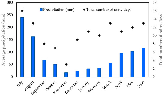 Monthly precipitation patterns in the study area from July 2022 to June 2023 (source: Pakistan Meteorological Department, 2023).